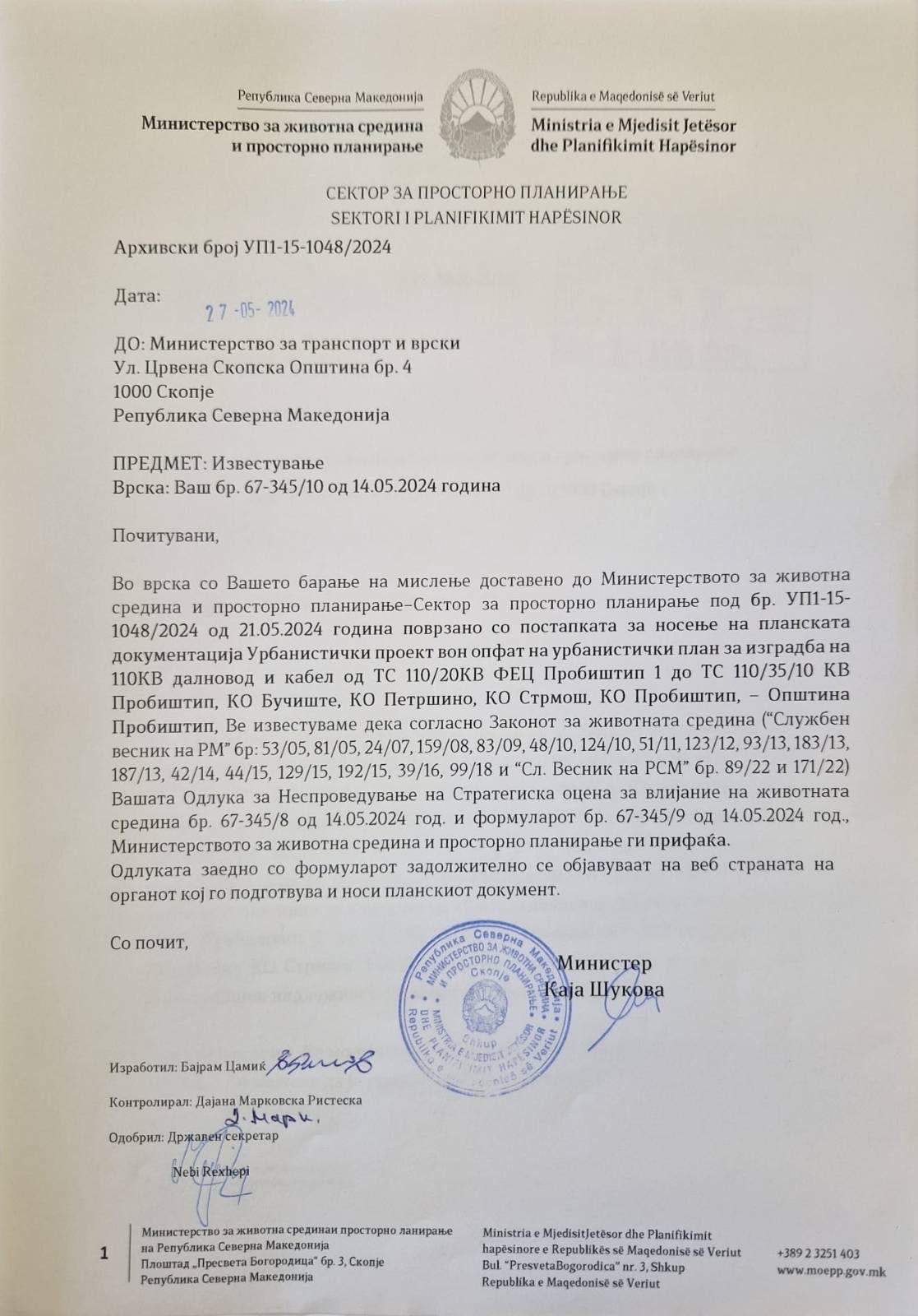 Одлука за Неспроведување на стратегиска оцена за Урбанистички проект вон опфат на урбанистички план за изградба на 110KV далновод и кабел од ТС 110/20kv ФЕЦ Пробиштип 1 до ТС 110/35/10 kv Пробиштип, КО Бучиште, КО Петршино, КО Стрмош, КО Пробиштип - општина Пробиштип